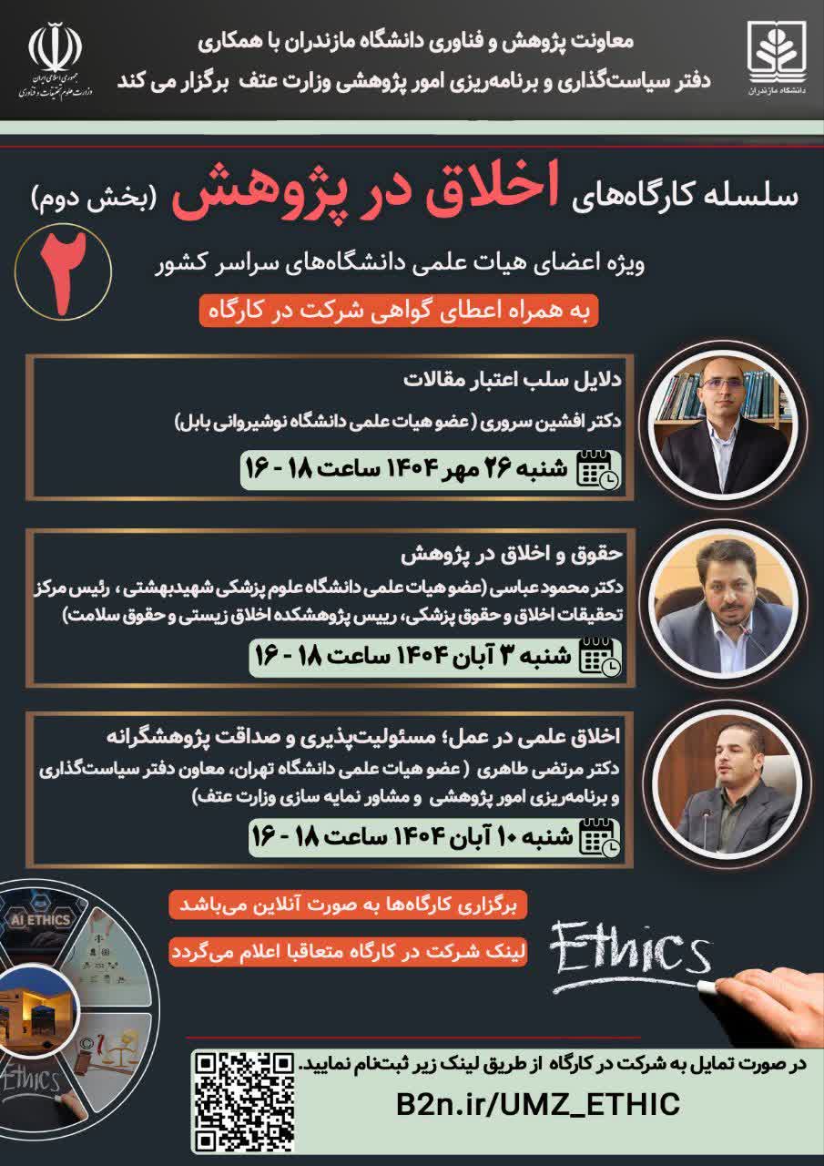اطلاعیه برگزاری سلسله کارگاه های اخلاق در پژوهش (بخش دوم)